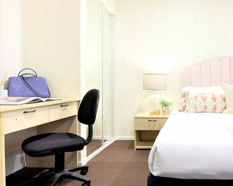 All accommodation is equipped with a contemporary kitchenette (with fridge, cooktop, rangehood, microwave, toaster, kettle, tea & coffee), hairdryer, iron & ironing board (upon request), dining table and chairs, study desk, chair & lamp, couch or sofa bed, bedside tables & lamps, unlimited Wi-Fi, flat-screen TV, reverse-cycle air conditioner, mirrored built-in wardrobe, window/s and your own private bathroom (with modern vanity, shower and toilet). Most apartments also have a balcony (available upon request). Guests have access to resort-style facilities including beautiful outdoor lap pool, sauna, fully-equipped gym, self-service laundry, hair salon and café. There is 24/7 reception/security, and room service is available for breakfast, lunch and dinner. Apartments range from comfortable, affordable studio apartments to our stunning ten new four-bedroom penthouse apartments with sweeping panoramic city views.