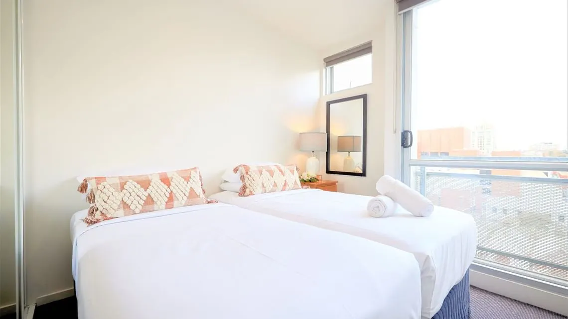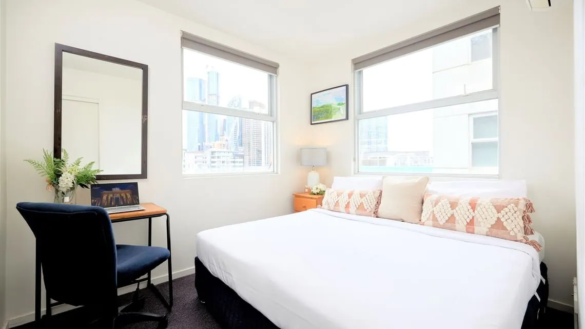 Experience elevated city living in the spacious Four Bedroom Penthouse at Arrow on Swanston, perfect for large families, groups, or extended stays near Melbourne CBD, RMIT, and the University of Melbourne. This impressive two‑storey penthouse is bathed in natural light, highlighting its expansive living spaces and creating a warm, welcoming atmosphere throughout. The bedding configuration includes one queen bed, one double bed, four single beds, and a sofa. Each bedroom provides abundant wardrobe space, ideal for long‑stay guests. Step out onto the expansive wraparound balcony, offering open views, fresh air, and seamless indoor–outdoor living. Guests enjoy free Wi‑Fi, air conditioning, a fully equipped kitchen, private bathrooms, and access to the on‑site gym, pool, sauna and guest laundry. With a tram stop right at the doorstep, accessing Melbourne’s top attractions is convenient and effortless.