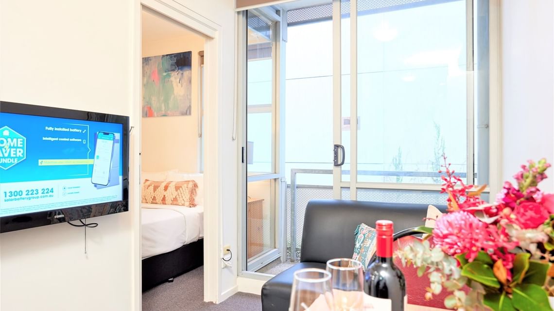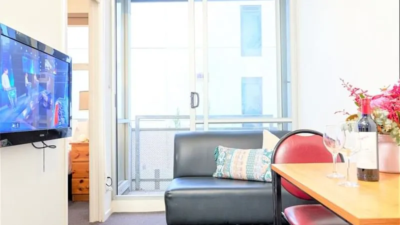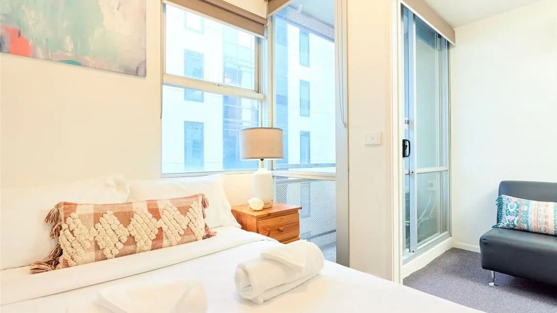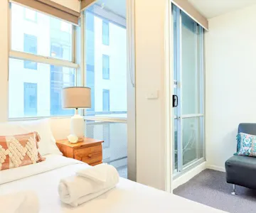Perfect for small families, friends, or guests seeking extra space, the Two Bedroom Apartment at Arrow on Swanston offers comfortable, self‑contained accommodation in an unbeatable Melbourne location. The main bedroom features a double bed, while the second bedroom includes a single bed, creating a practical layout for up to three guests. A fully equipped kitchenette provides everything needed for convenient in‑room dining, and the apartment includes a modern private bathroom, a dining area, free Wi‑Fi, air conditioning, a mirrored wardrobe, and a flat‑screen TV. Each bedroom includes a window, offering natural light and ventilation during your stay. Guests also enjoy access to the on‑site swimming pool, sauna, fully‑equipped gym, self‑service laundry, hair salon and café.